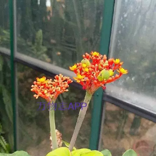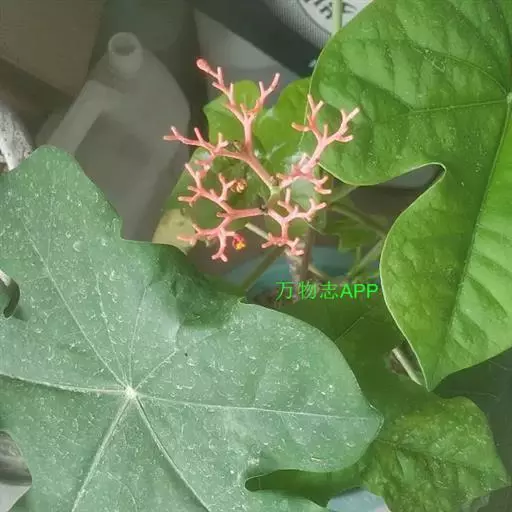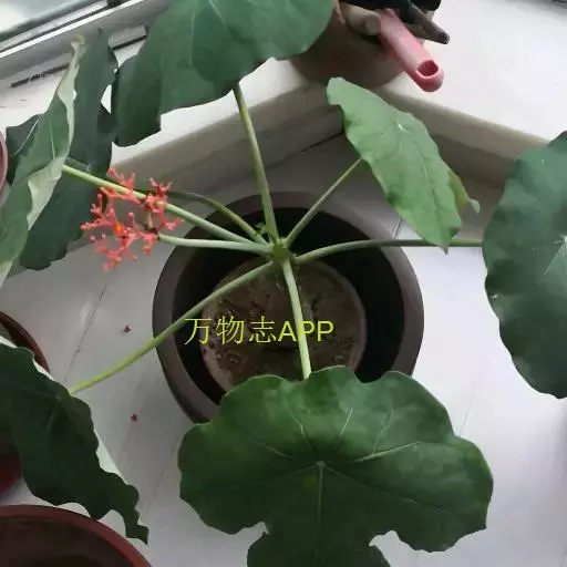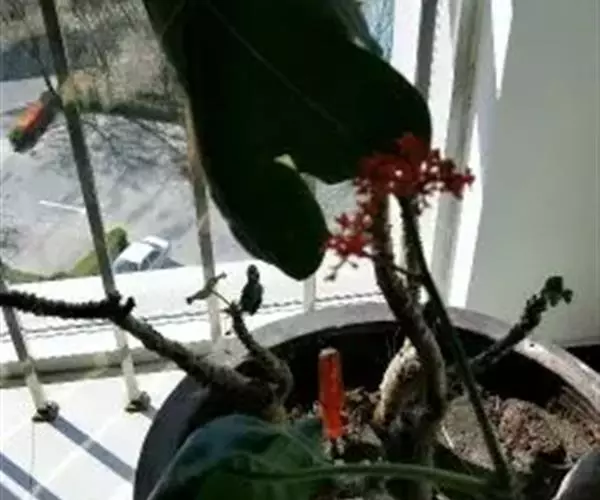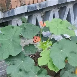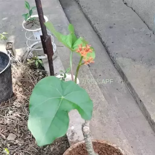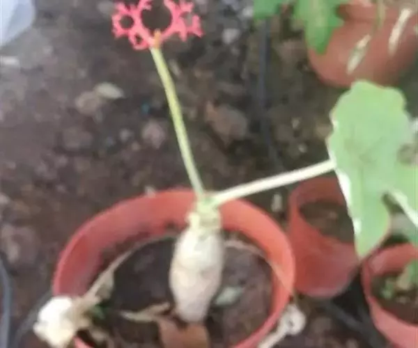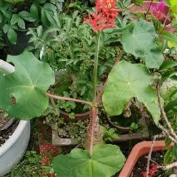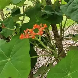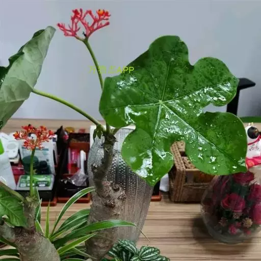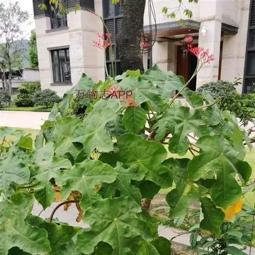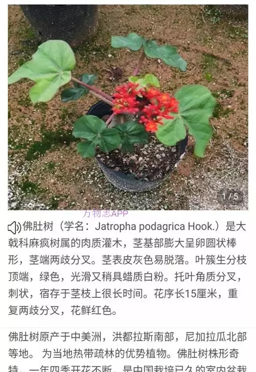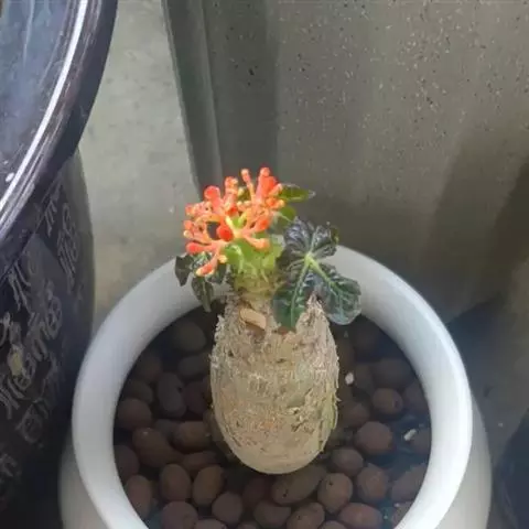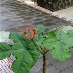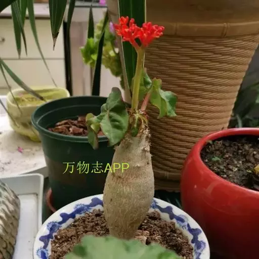 佛肚树(学名:Jatropha podagrica Hook.)是大戟科麻疯树属的肉质灌木,茎基部膨大呈卵圆状棒形,茎端两歧分叉。茎表皮灰色易脱落。叶簇生分枝顶端,绿色,光滑又稍具蜡质白粉。托叶角质分叉,刺状,宿存于茎枝上很长时间。花序长15厘米,重复两歧分叉,花鲜红色。