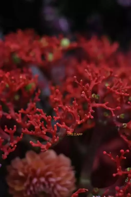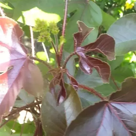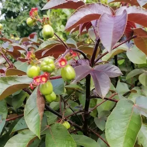 花序顶生,具长总梗,分枝短,红色,花萼长约2毫米,裂片近圆形,长约1毫米;花瓣倒卵状长圆形,长约6毫米,红色;雄花:雄蕊6-8枚,基部合生,花药与花丝近等长;雌花:子房无毛,花柱3枚,基部合生,顶端2裂。蒴果椭圆状,长13-18毫米,直径约15毫米,具3纵沟;种子长约1.1厘米,平滑。花期几全年。
