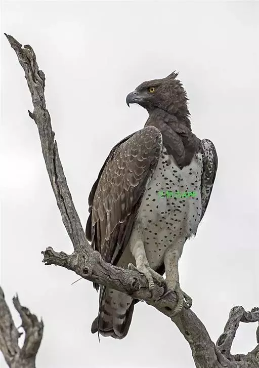 成鸟的羽毛覆盖上部、头部和胸部的深褐色部分组成,偶尔在这些羽毛上有轻微的边饰。根据光线条件,深色羽毛可能会呈现灰色、深栗色甚至李子色。身体下部是白色的,有稀疏但明显的黑褐色斑点。下翼是深褐色的,其余的是苍白的条纹和黑色,总体上成鸟的双翼有着暗色的外观。尾巴下面有类似的阻碍物,而上侧是相同的统一的棕色作为背部和上翼覆盖。成熟的猛雕的眼睛是饱和的黄色,而蜡膜和足发苍绿色,爪为黑色。猛雕有一个短的可勃起的羽冠,通常既不突出也不张开(不像冕雕),通常看起来像是一个有棱角的回平的头。本种猛禽栖姿通常相当直立,长双翼完全覆盖尾巴,因此它被描述为“立”而不是“坐”在树枝上栖息。飞行中,猛雕长而宽的双翼有相对较窄的圆形尖端。根据雕是如何举起双翼的,有时会显得尖窄。它能够灵活地拍打双翼,用扁平的双翼上滑翔,或者在二面体上稍微抬高。这一物种通常一天中的大部分时间都在翱翔中度过,比任何其他非洲雕类都要多,而且经常处于很高的空中 。幼年猛雕的羽毛明显不同,上面为珍珠灰色,边缘有相当大的白色,冠部和后颈上有斑点的灰色。整个底面是明显的白色。幼鸟的双翼夹杂的灰褐色和白色,在初生个体和尾巴上有类似于成年但较轻和灰色的条纹图案。在第4年或第5年,羽毛上的褐色斑点逐渐增加,但背部和冠部仍保持相当浅的灰色。在这个年龄,喉部和胸部可能会出现越来越多的斑点,这些斑点合并成斑块,腹部也可能出现一些不同的斑点。亚成体的眼睛是深褐色的。本种在第七年长全成年羽毛,在幼年羽毛发生一些变化后,向成年羽毛的转变非常迅速。该物种几乎没有严重的鉴定挑战。黑胸蛇雕(Circaetus spectoralis)的整体颜色与猛雕相似(尽管它的名字在胸部和背部是浅棕色的,没有成年猛雕深),但体型明显较小,头部相对突出,圆圆,眼睛大,腹部平坦,一尘不染,腿裸露而发白。在飞行中,蛇雕的外形非常不同,它的飞行羽毛几乎是白色(而不是深棕色),双翼更小更窄,尾巴也相对较大。对于亚成体猛雕来说,潜在的鉴定困惑主要来源于亚成体冕雕,它也经常栖息在直立的位置。冕雕的身体比例与猛雕非常不同,因为它们的双翼短得多,尾巴明显更长。亚成体冕雕有一个更白的头,更小,并缺乏猛雕在腿部的斑纹。除了飞行轮廓中双翼和尾巴比例不同外,冕雕的飞行羽毛和尾巴颜色更白,更明显。非洲其他大型雕的亚成体往往比猛雕更黑,上下标记更重 。