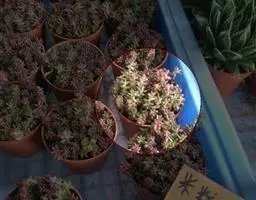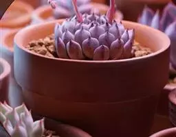 紫珍珠是景天科石莲花属的多年生肉质草本植物。植株中小型;叶片肉质,匙形,呈莲座状紧密排列;叶片粉紫色,…