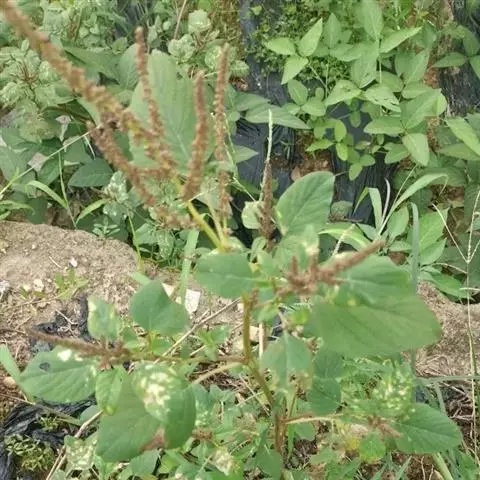 反枝苋是苋科苋属的一年生草本植物。株高达1米;茎密被柔毛;叶菱状卵形或椭圆状卵形,先端锐尖或尖凹,…