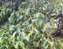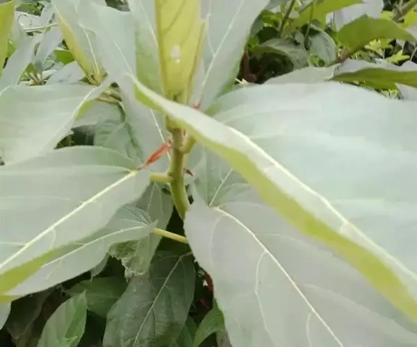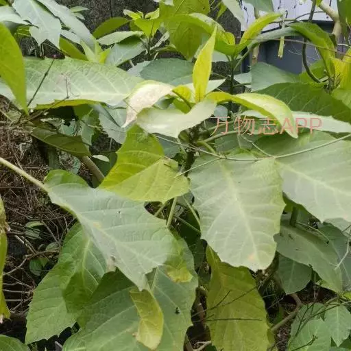 对叶榕(原变种),灌木或小乔木,被糙毛,叶通常对生,厚纸质,卵状长椭圆形或倒卵状矩圆形,长10-25厘米,宽5-10 厘米,全缘或有钝齿,顶端急尖或短尖,基部圆形或近楔形,表面粗糙,被短粗毛,背面被灰色粗糙毛,侧脉6-9对;叶柄长1-4厘米,被短粗毛;托叶2,卵状披针形,生无叶的果枝上,常4枚交互对生,榕果腋生或生于落叶枝上,或老茎发出的下垂枝上,陀螺形,成熟黄色,直径1.5-2.5厘米,散生侧生苞片和粗毛,雄花生于其内壁口部,多数,花被片3,薄膜状,雄蕊1;瘿花无花被,花柱近顶生,粗短;雌花无花被,柱头侧生,被毛。花果期6-7月。