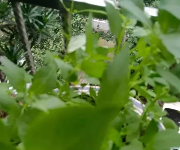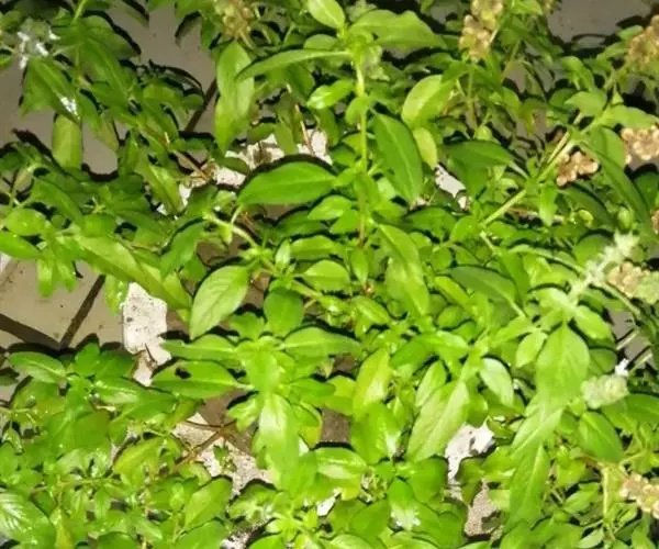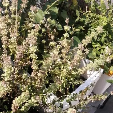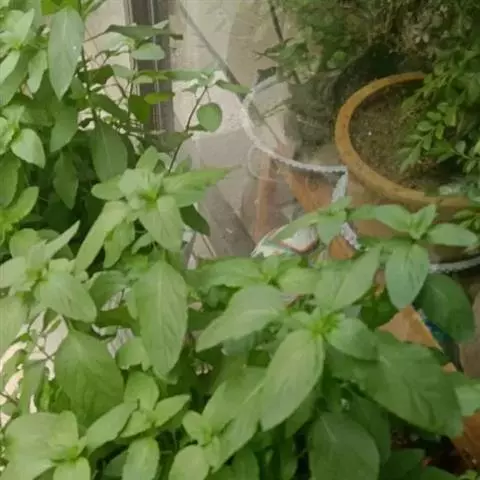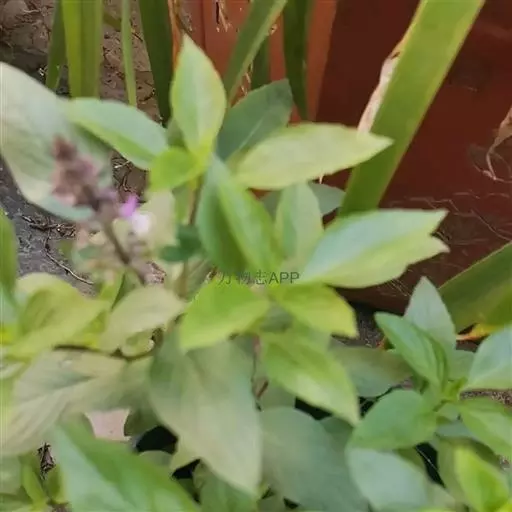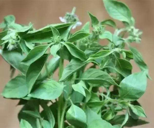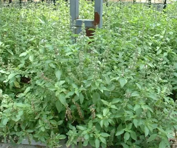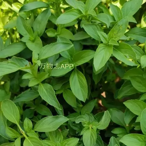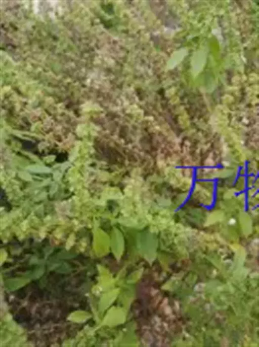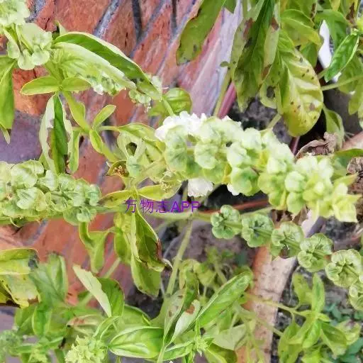 圣罗勒(O.cimum sanctum),基部木质化,花白色或粉红色,叶片上有毛,叶缘有齿,具香辣味。