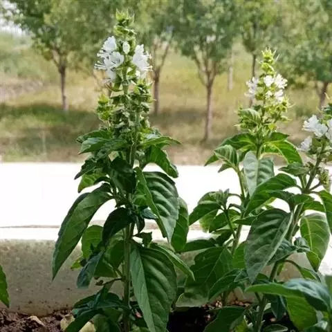 甜罗勒:为罗勒属中以幼嫩茎叶为食的一年生草本植物,矮生,栽培最为广泛,在我国也较为常见,形成紧实的植株丛,株高25~30cm,叶片亮绿色,长2.5~2.7cm,花白色,花茎较长,分层较多。