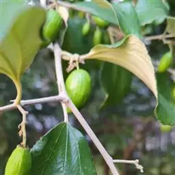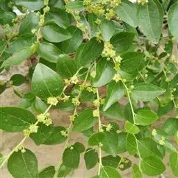 枣树 落叶小乔木,稀灌木,高达10余米;树皮褐色或灰褐色;有长枝,短枝和无芽小枝(即新枝)比长枝光滑,紫红色或灰褐色,呈之字形曲折,具2个托叶刺,长刺可达3厘米,粗直,短刺下弯,长4-6毫米;短枝短粗,矩状,自老枝发出;当年生小枝绿色,下垂,单生或2-7个簇生于短枝上。