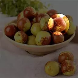 鸡蛋枣 果实特大,近圆形,平均单果重30克,最大50克。果实大小均匀,果皮厚,深红色。鲜枣可溶性固形物含量31%-35%,可食率97%。果肉质细,酥脆多汁,香甜可口。9月中下旬开始成熟,成熟期遇雨不易裂果,耐贮茂,是优良的鲜食、制干、蜜饯兼用品种,旱台地和水地均可栽培。