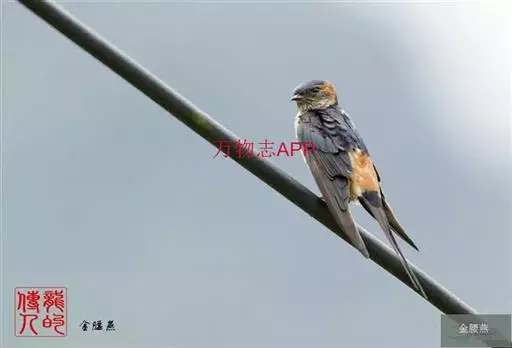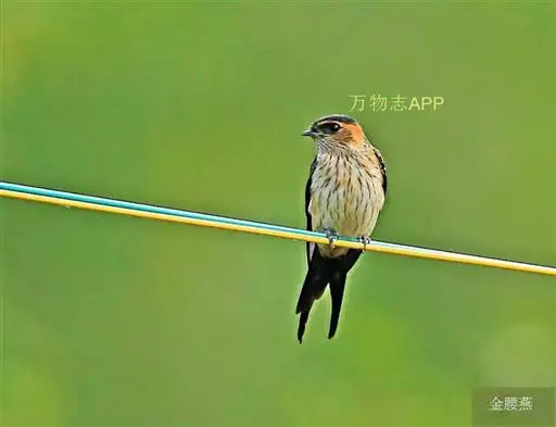 金腰燕(学名:Cecropis daurica):体长16-18厘米,体重18-21克,寿命15年。上体黑色,具有辉蓝色光泽,腰部栗色,脸颊部棕色,下体棕白色,而多具有黑色的细纵纹,尾甚长,为深凹形。最显著的标志是有一条栗黄色的腰带,浅栗色的腰与深蓝色的上体成对比,下体白而多具黑色细纹,尾长而叉深。 虹膜褐色;嘴及脚黑色。喙短而宽扁,基部宽大,呈倒三角形,上喙近先端有一缺刻;口裂极深,嘴须不发达。翅狭长而尖,尾呈叉状,形成“燕尾”,脚短而细弱,趾三前一后。