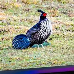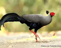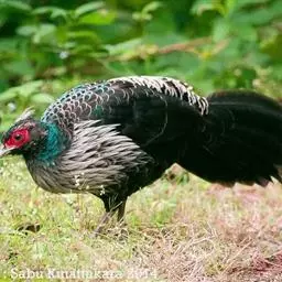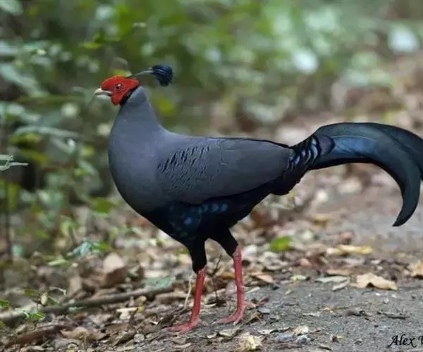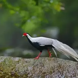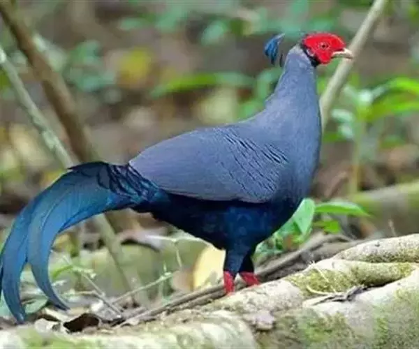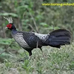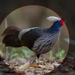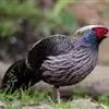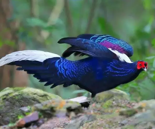 蓝鹇(学名:Lophura swinhoii)是雉科、鹇属一种大型雉类。体长50-80厘米。雄鸟头颈黑色,羽冠白色,有时杂以黑斑;脸红色,额部肉冠和脸部肉垂亦为红色;后颈和颈侧蓝黑色;肩赤红色;翅上覆羽及外侧次级飞羽黑色,具金属绿色羽缘;初级飞羽暗棕褐色,次级飞羽和覆羽黑褐色;尾羽中央一对白色。下体黑褐色,胸及两胁具金属暗蓝色光泽。 雌鸟头顶至后颈红褐色。外侧7对尾羽暗栗色,微缀黑色。颏、喉淡褐色,胸红褐色,其余下体黄褐色,密被黑色‘V’字形斑和细小黑色虫蠹状斑。 嘴角色,脚和趾红色,雄鸟具距,颜色为角色。