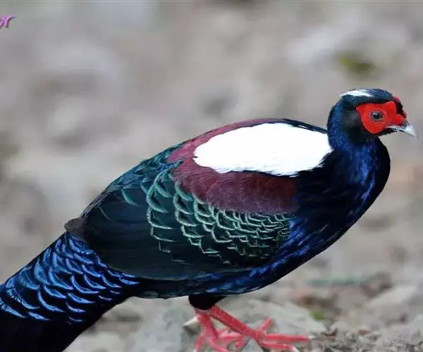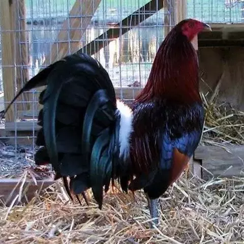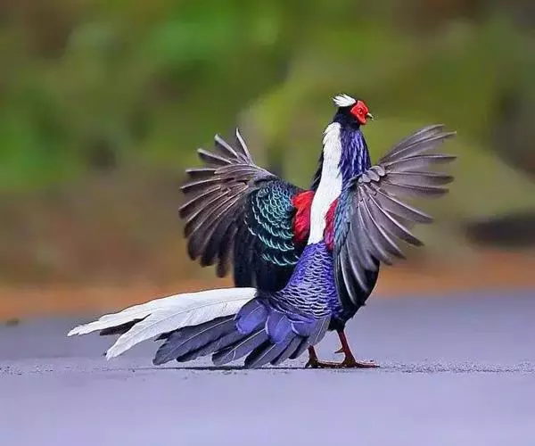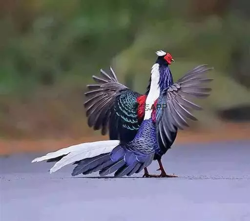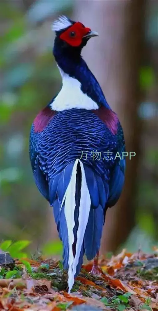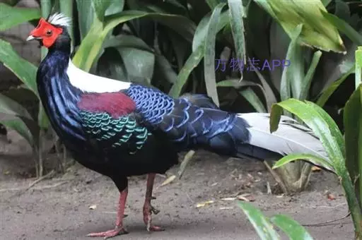 雄鸟头颈黑色,羽冠白色,有时杂以黑斑;脸红色,额部肉冠和脸部肉垂亦为红色;后颈和颈侧蓝黑色,具金属光泽;上背白色,下背、腰及较短的尾上覆羽黑色,具金属鲜蓝色羽缘;肩赤红色;翅上覆羽及外侧次级飞羽黑色,具金属绿色羽缘;初级飞羽暗棕褐色,次级飞羽和覆羽黑褐色;尾羽中央一对白色,其余尾羽黑色,微缀蓝色,第二对尾羽内翈有时也为白色。下体黑褐色,胸及两胁具金属暗蓝色光泽。