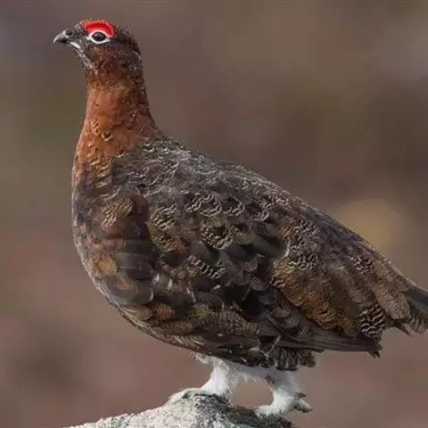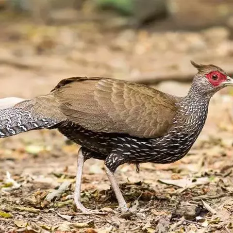 雌鸟头顶至后颈红褐色,头上有一短的羽冠,亦为红褐色,各羽均杂有黑色细小虫蠹状斑和具棕黄色羽干纹;背、肩和翅上覆羽亦为红褐色,但羽中部黑色,且呈‘V’字斑纹;下背、腰和尾上覆羽黑色,密杂以皮黄色虫蠹状斑;初级飞羽和次级飞羽暗褐色,初级飞羽具棕色横斑,次级飞羽具淡褐色或皮黄色横斑;中央1对尾羽和尾上覆羽同色,但杂有黄色斑点。外侧7对尾羽暗栗色,微缀黑色。颏、喉淡褐色,胸红褐色,其余下体黄褐色,密被黑色‘V’字形斑和细小黑色虫蠹状斑。嘴角色,脚和趾红色,雄鸟具距,颜色为角色。