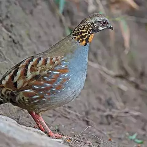 体大的灰褐色鹑类。胸灰色具黑色细纹。与相似种类四川雉鹑不同处在于栗色喉块外缘近白。有猩红色眼周裸皮。…