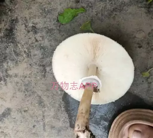 子实体中等至稍大。菌盖直径3-15厘米不等,初半球形,后 大孢花褶伞 近平展,有时中部下凹,白色或乳白色,光滑或后期具丛毛状鳞片,开燥时边缘开裂。菌肉白色,厚。菌褶粉红色呈褐色,黑色,较密,离生,不等长。菌柄粗短,圆柱形,稍弯曲,1-9×0.5-2厘米,近光滑或略有纤毛,白色,内实。菌环单层,白色,膜质,生于菌柄中部,易脱落。担子上有两个担孢子,所以称为双孢蘑菇,孢子印深褐色。孢子褐色,椭圆形,光滑,6.5-10×5-6.5微米。