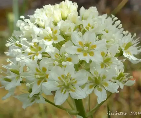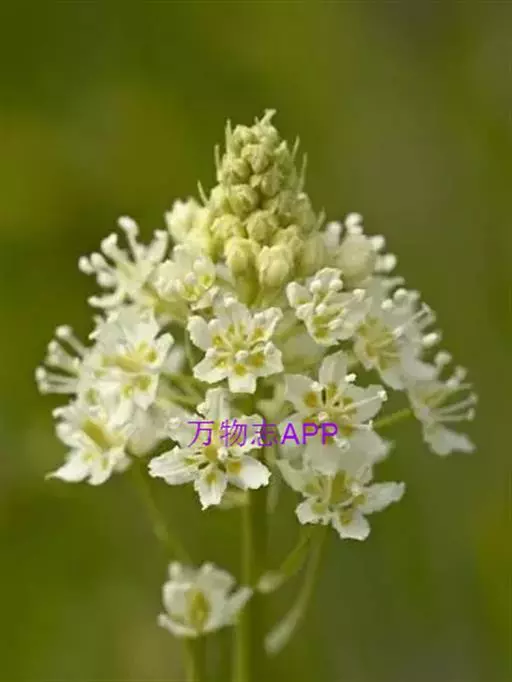 多年生草本,植株高30-50厘米;鳞茎小葱头状,外层鳞茎皮黑褐色,有时上部稍撕裂为纤维。叶基生,条形,长12-33厘米,宽2-8毫米,在花葶下部常有1-2枚短叶。总状花序或圆锥花序具疏松的花;花梗长7-20毫米,基部有苞片;花被片绿白色,倒卵状矩圆形至矩圆形,长6-9毫米,宽约2.5毫米,内面基部上方有一顶端2裂的肉质腺体;雄蕊稍短于花被片,花丝向下部逐渐扩大,花药近肾形;子房圆锥形,长约4毫米;花柱3,近果期稍伸出花被外,外卷。蒴果圆锥形,长约15毫米。种子近矩圆形,长约5毫米,有狭翅。