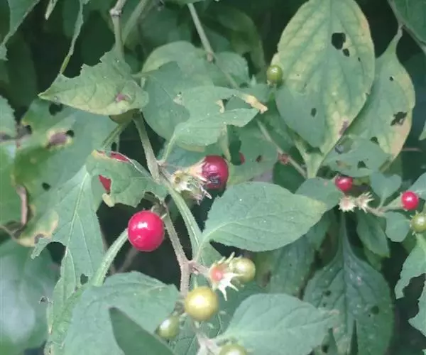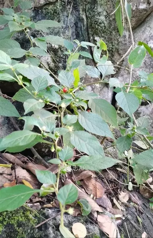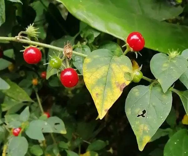 灌木或亚灌木,高0.5-1.5米,小枝、叶下面、叶柄、花梗及萼的外面密被淡黄色的单毛及1-2分枝或树枝状分枝的绒毛。上部叶常假双生,大小不相等;大叶片椭圆状卵形,偏斜,先端渐尖,基部楔形渐窄至叶柄而成窄翅,长约9-13-15厘米,宽约3.5-5-7厘米;叶柄长约2-4厘米;小叶片宽卵形,先端短渐尖,基部宽圆形而后骤窄下延至柄而成窄翅,长2.5-4厘米,宽2-3厘米;叶柄长约0.5-1厘米,两种叶均膜质,全缘,上面绿色,被简单具节分散的短柔毛;下面灰绿色。花序无柄,通常2-3朵少4-5朵花着生于叶腋内;花梗短,约5-8毫米;萼杯状,长约3毫米,直径约3.5毫米,萼齿10,钻状线形,长约2毫米,两面均被有与萼外面相同的毛被;花冠淡紫色或白色,星形,直径约10-12毫米,顶端深5裂,裂片披针形,端尖,长约6毫米,宽约1.5毫米,外面在中上部及边缘被有平伏的短而尖的单毛;花冠筒隐于萼内,长约1.5毫米,冠檐长约7.5毫米,基部具深色(干时黑色)的斑点,花丝长约1毫米,光滑,花药近椭圆形,长约3毫米,宽约1毫米,在内面常被微柔毛,顶孔向内,偏斜。子房卵形,长约2毫米,宽约1.8毫米,光滑,花柱纤细,长约8毫米,光滑,柱头头状。果柄长约1-1.5厘米,浆果球形,直径约6-8毫米,成熟果绯红色,宿萼盘形,萼齿长约4-5毫米,与果柄同样被有与小枝相似的毛被;种子多数,淡黄色,近卵形至近三角形,水平压扁,约长2毫米,宽1.5毫米,外面具凸起的网纹。花期5-8月,果期7-11月 。