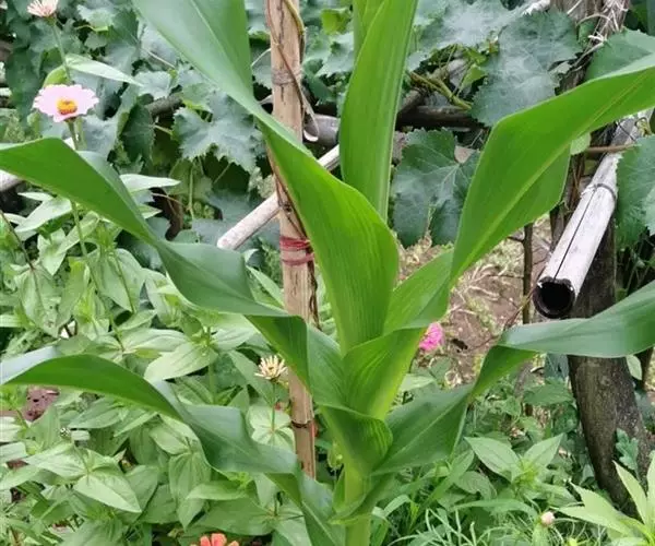 高大的一年生栽培植物。秆粗壮,直立,高1-4m,通常不分枝,基部节处常有气生根。叶片宽大,线状披针形,边缘呈波状皱折,具强壮之中脉。在秆顶着生雄性开展的圆锥花序;雄花序的分枝三棱状,每节有2雄小穗,1无柄,1有短柄;每1雄小穗含2小花,颖片膜质,先端尖;外稃及内稃均透明膜质;在叶腋内抽出圆柱状的雌花序,雌花序外包有多数鞘状苞片,雌小穗密集成纵行排列于粗壮的穗轴上,颖片宽阔,先端圆形或微凹,外稃膜质透明。花、果期7-9月。