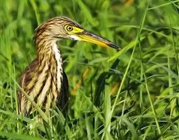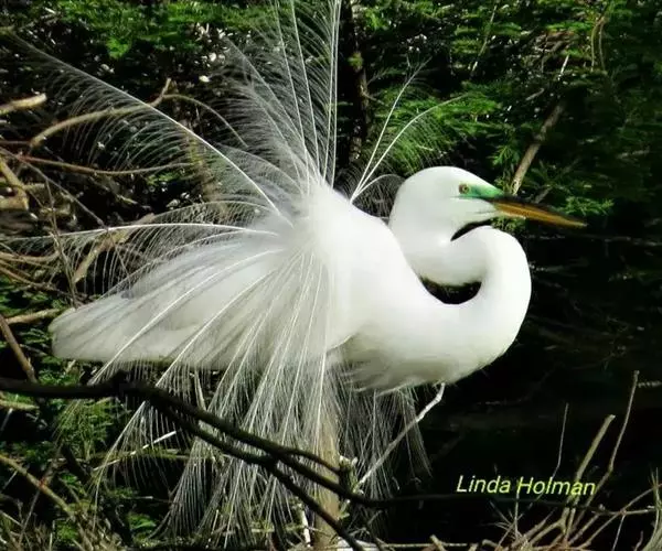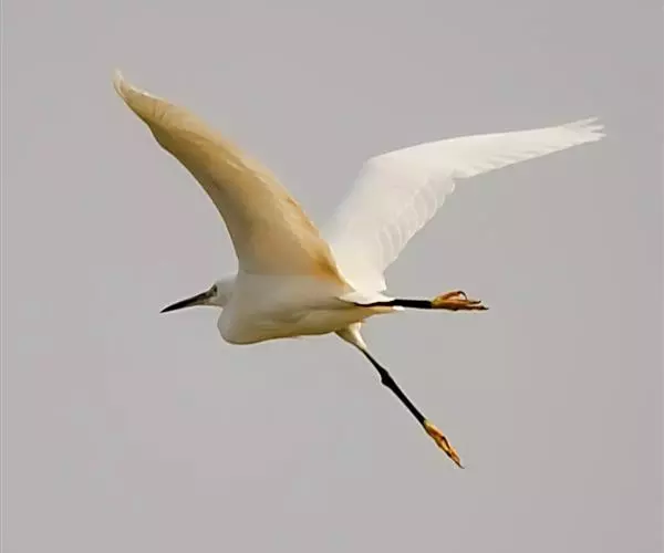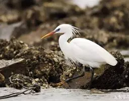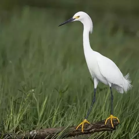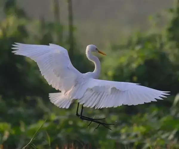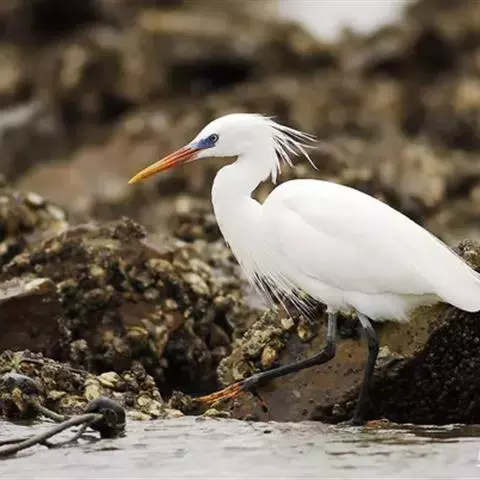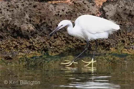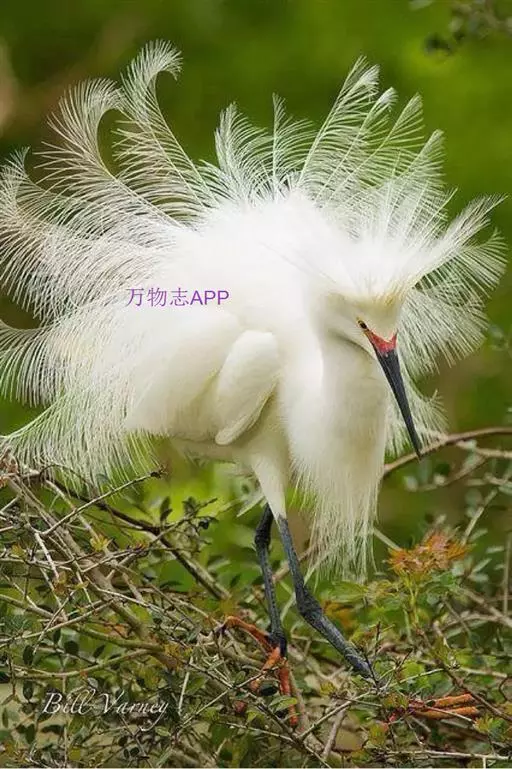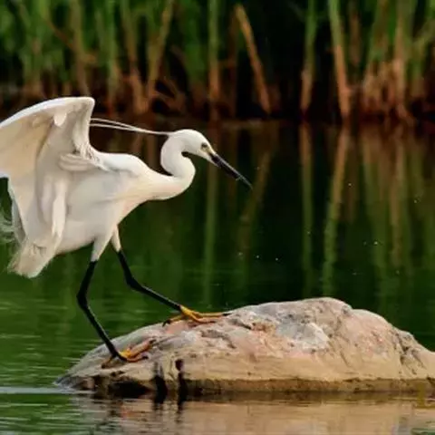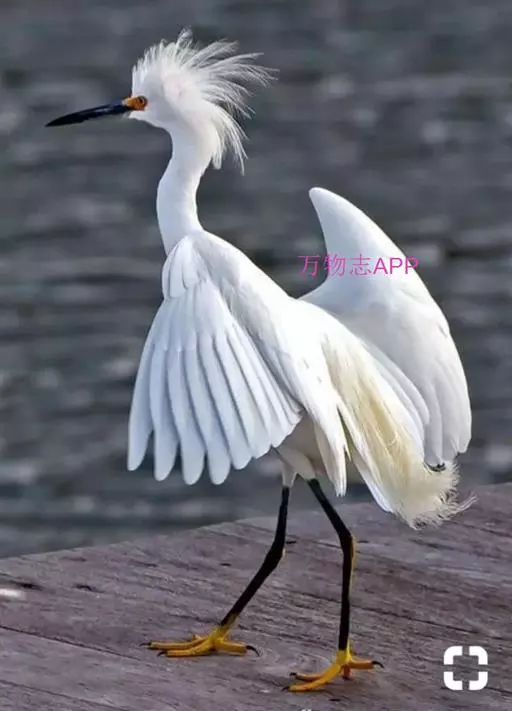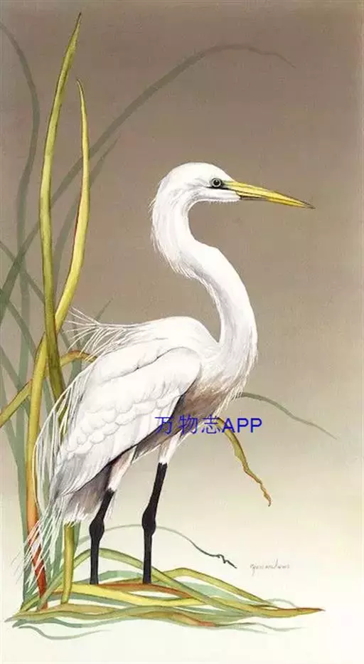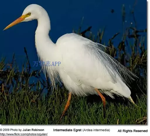 描述:中等体型(60厘米)的白色鹭。与牛背鹭的区别在体型较大而纤瘦,嘴及腿黑色,趾黄色,繁殖羽纯白,颈背具细长饰羽,背及胸具蓑状羽。