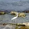 体长60~70厘米;全身白色,眼先黄色,虹膜淡黄色,脚和址黑色;繁殖羽背部和前颈下部有蓑状饰羽,头后有不甚明显的冠羽,嘴黑色。栖息和活动于河流、湖泊、水稻田、海边和水塘岸边浅水处。常单独、成对或成小群活动,有时亦与其他鹭混群。生性胆小,很远见人即飞。飞行时颈缩成“S”形,两脚直伸向后,超出于尾外,两翅鼓动缓慢,飞行从容不迫,且成直线飞行。主要以小鱼、虾、蛙、蝗虫、蝼蛄等动物为食。中白鹭在我国南方为夏候鸟,亦有部分留下越冬。