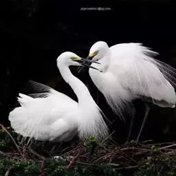 雪鹭 繁殖期为每年的5~7月,营巢于近海岸的岛屿和海岸悬岩处的岩石上或矮小的树杈之间。喜欢成群地在一起营巢,有人曾经在一块仅有大约20平方米的悬岩的岩顶上,竟发现了14个巢,而且在相邻的一块仅有10多平方米的悬岩的岩顶上,还有11个巢,每个巢之间的距离仅为14~76厘米。从前在台湾,也曾有黄嘴白鹭和白鹭、牛背鹭、夜鹭和苍鹭等混群营巢的现象。它的巢的形状为浅碟形,结构较为简单,主要以枯草茎和草叶构成。巢筑于矮树上,距地面的高度最高的也不超过1米,也有在矮树下的草丛间筑巢的。每窝产卵2~4枚,卵的形状为卵圆形,颜色为淡蓝色。孵化期为24~26天。