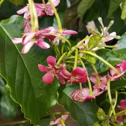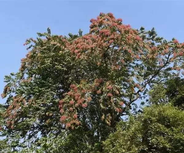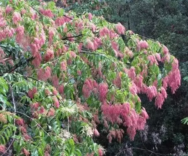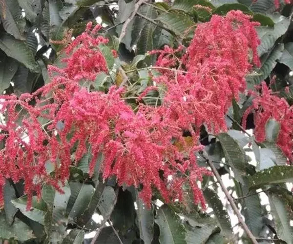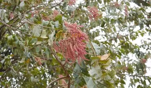 大型圆锥花序,顶生或腋生,长18-26厘米,总轴密被黄色绒毛。花极小,极多数,两性,红色,长(连小花梗)4毫米;小苞片三角形,宿存;萼筒杯状,长2毫米,5齿裂;雄蕊10,突出;具花盘。瘦果细小,极多数,有3翅,其中2翅等大,1翅特小,长约3毫米,宽(连翅)12毫米,翅膜质,干时苍黄色,被疏毛,大翅对生,长方形,小翅位于两大翅之间。花期8-9月,果期10月至翌年1月。