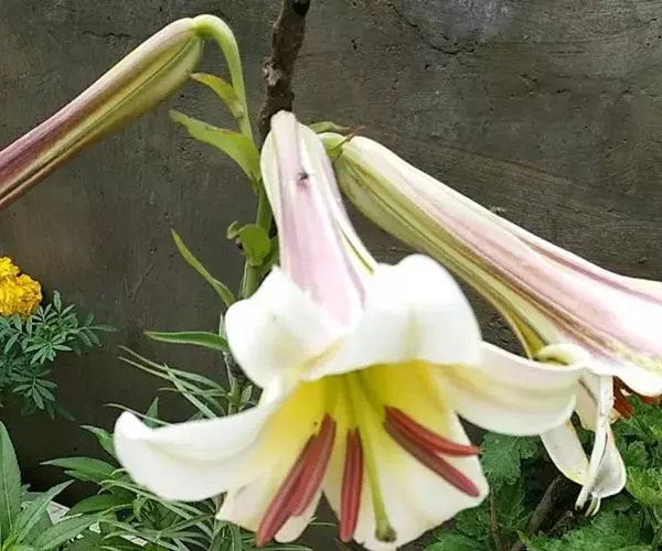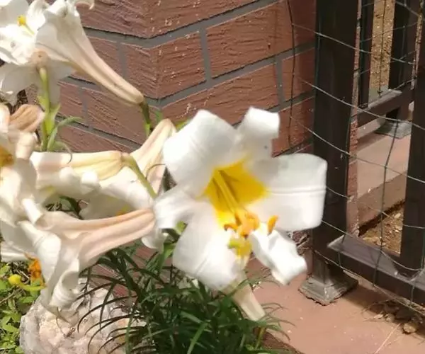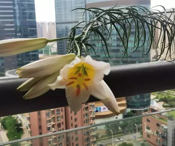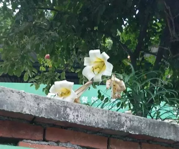 花1至数朵,开放时很香,喇叭形,白色,喉部为黄色;外轮花被片披针形,长9-11厘米,宽1.5-2厘米;内轮花被片倒卵形,先端急尖,下部渐狭,蜜腺两边无乳头状突起;花丝长6-7.5厘米,几无乳头状突起,花药椭圆形,长0.9-1.2厘米,宽约3毫米;子房圆柱形,长约2.2厘米,宽约3毫米;花柱长6厘米,柱头膨大,宽6毫米。花期6-7月。