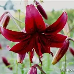 川百合:鳞茎为扁球形,白色。茎干绿色,上半部有小突起及稀疏的绵毛。叶片散生,为线状披针形, 边缘反…