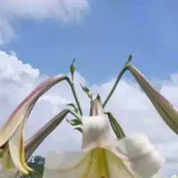 百合花的种头是由近百块鳞片抱合而成,古人视为“百年好合”、“百事合意”的吉兆。故历来许多情侣在举行婚礼时都要用百合来做新娘的捧花。除了这种好意头之外,它那副端庄淡雅的芳容确实十分可人。它植株挺立,叶似翠竹,沿茎轮生,花色洁白,状如喇叭,姿态异常优美,能散出隐隐幽香,被人誉为“云裳仙子”。故在国际花卉市场上长期走俏,历久不衰。