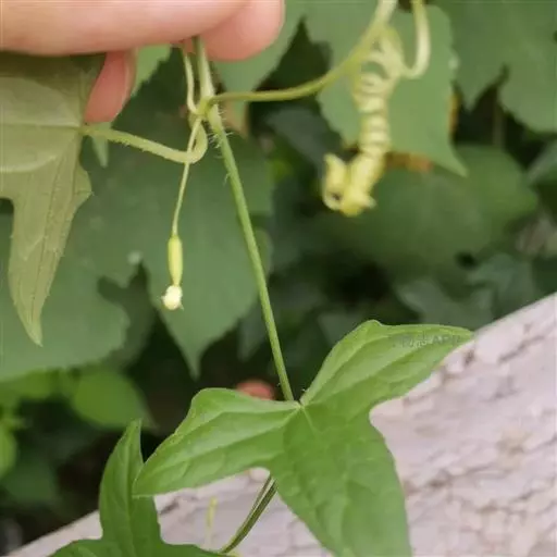 茅瓜又名:异叶马㼎儿。攀援草本,块根纺锤状,径粗1.5-2厘米。茎、枝柔弱,无毛,具沟纹。叶柄纤细,短,长仅0.5-1厘米,初时被淡黄色短柔毛,后渐脱落;叶片薄革质,多型,变异极大,卵形、长圆形、卵状三角形或戟形等,不分裂、3-5浅裂至深裂,裂片长圆状披针形、披针形或三角形,长8-12厘米,宽1-5厘米,先端钝或渐尖,上面深绿色,稍粗糙,脉上有微柔毛,背面灰绿色,叶脉凸起,几无毛,基部心形,弯缺半圆形,有时基部向后靠合,边缘全缘或有疏齿。卷须纤细,不分歧。雌雄异株。雄花:10-20朵生于2-5毫米长的花序梗顶端,呈伞房状花序;花极小,花梗纤细,长2-8毫米,几无毛;花萼筒钟状,基部圆,长5毫米,径3毫米,外面无毛,裂片近钻形,长0.2-0.3毫米;花冠黄色,外面被短柔毛,裂片开展,三角形,长1.5毫米,顶端急尖;雄蕊3,分离,着生在花萼筒基部,花丝纤细,无毛,长约3毫米,花药近圆形,长1.3毫米,药室弧状弓曲,具毛。雌花:单生于叶腋;花梗长5-10毫米,被微柔毛;子房卵形,长2.5-3.5毫米,径2-3毫米,无毛或疏被黄褐色柔毛,柱头3。果实红褐色,长圆状或近球形,长2-6厘米,径2-5厘米,表面近平滑。种子数枚,灰白色,近圆球形或倒卵形,长5-7毫米,径5毫米,边缘不拱起,表面光滑无毛。花期5-8月,果期8-11月。