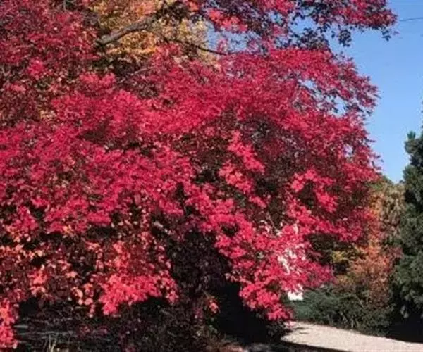 春季新叶泛红,与成串的红色花朵相映成趣;夏季枝叶成阴;秋季叶片为绚丽的红色,持续时间长。树型直立向上,树冠圆形。春天开红色小花,果有翅,红色。该树种生长迅速,是所有美国红枫品种中生长最快的品种。 习性特点: 适应性较强,耐寒、耐旱、耐湿。我国北京、河北、山东、辽宁、吉林、河南、陕西、安徽、江苏、上海、浙江、江西、湖南、湖北、云南、四川、新疆等地的气候均适宜,每年秋季纯正的改良红枫都能稳定地表现出绚丽的红叶效果,酸性至中性的土壤使秋色更艳。