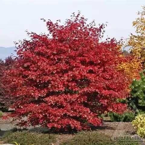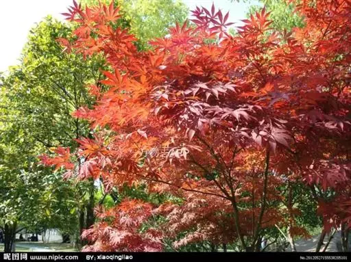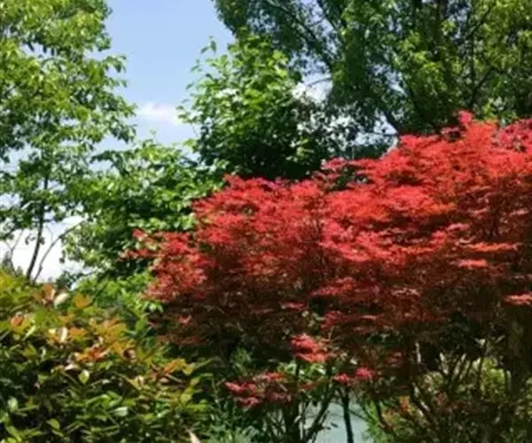 中国红枫最大的特点就是秋季变色由正常绿色变为红色,古人“十月霜叶红似火”,“霜叶红于二月花” 但是中国红枫大部分都是播种苗,变异性比较大.而且随地域的差异变色效果差异比较明显。甚至同一地方不同苗木之间差异也是很大的。而且变色色彩不是很鲜明.红色不是很正.且其间总会有杂色.观赏效果一般。