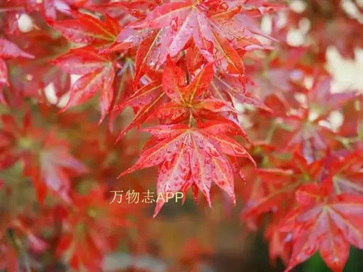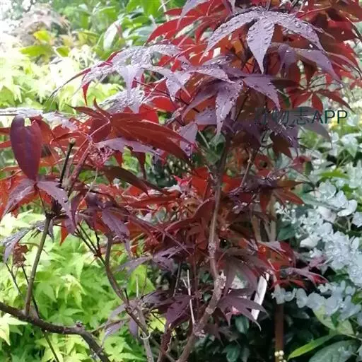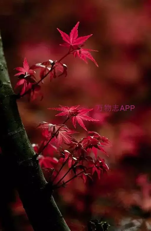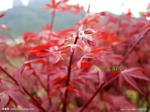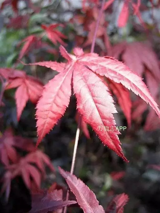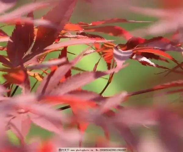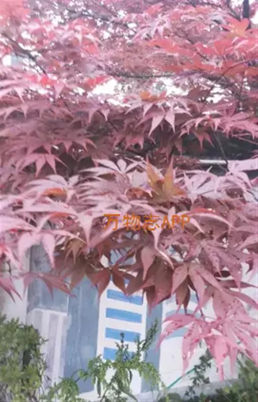 中国红枫又名红叶羽毛枫,为槭树科鸡爪槭的变种,是落叶小乔木,树高达9米。它枝条光滑细长,单叶5—7裂,掌状互生,叶片长椭圆形至披针形,叶缘有重锯齿,幼枝、叶柄、花柄都为红色。花紫色,伞状花序顶生,花期5月。翅果无毛,10月成熟。