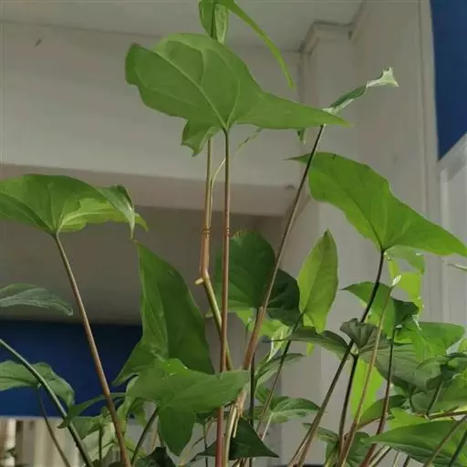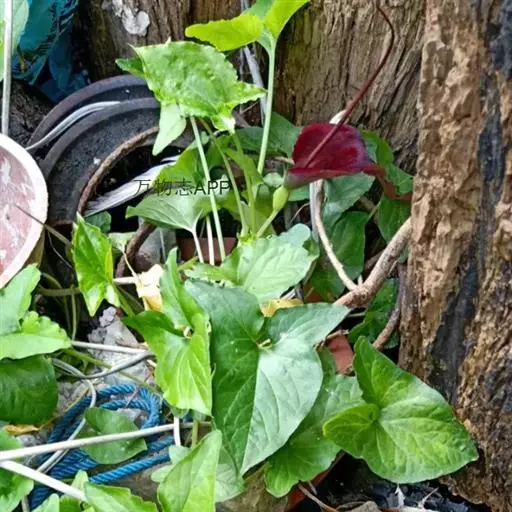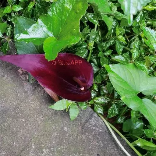 犁头尖,又名老鼠尾。块茎近球形、头状或椭圆形,直径1-2厘米,褐色,具环节,节间有黄色根迹,颈部生长1-4厘米的黄白色纤维状须根,散生疣凸状芽眼。幼株叶1-2,叶片深心形、卵状心形至戟形,长3-5厘米,宽2-4厘米,多年生植株有叶4-8枚,叶柄长20-24厘米,基部4厘米鞘状、莺尾式排列,淡绿色,上部圆柱形,绿色;叶片绿色,背淡,戟状三角形,前裂片卵形,长7-10厘米,宽7-9厘米;后裂片长卵形,外展,长6厘米,基部弯缺呈“开”形;中肋2面稍隆起,侧脉3-5对,最下1对基出,伸展为侧裂片的主脉,集合脉2圈。花序柄单1,从叶腋抽出,长9-11厘米,淡绿色,圆柱形,粗2毫米,直立。佛焰苞:管部绿色,卵形,长1.6-3厘米,粗0.8-1.5厘米;檐部绿紫色,卷成长角状,长12-18厘米,下部粗6毫米,盛花时展开,后仰,卵状长披针形,宽4-5厘米,中部以上骤狭成带状下垂,先端旋曲,内面深紫色,外面绿紫色。肉穗花序无柄,雌花序圆锥形,长1.5-3毫米,粗3-4毫米;中性花序长1.7-4厘米,下部7-8毫米长具花,连花粗4毫米,无花部分粗约1毫米,淡绿色;雄花序长4-9毫米,粗约4毫米,橙黄色;附属器深紫色,具强烈的粪臭,长10-13厘米,基部斜截形,明显具细柄,粗4毫米,向上渐狭成鼠尾状,近直立,下部1/3具疣皱,向上平滑。雄花近无柄,雄蕊2,药室2,长圆状倒卵形,雌花:子房卵形,黄色,柱头无柄,盘状具乳突,红色。中性花同型,线形,长约4毫米,上升或下弯,两头黄色,腰部红色。花期5-7月。