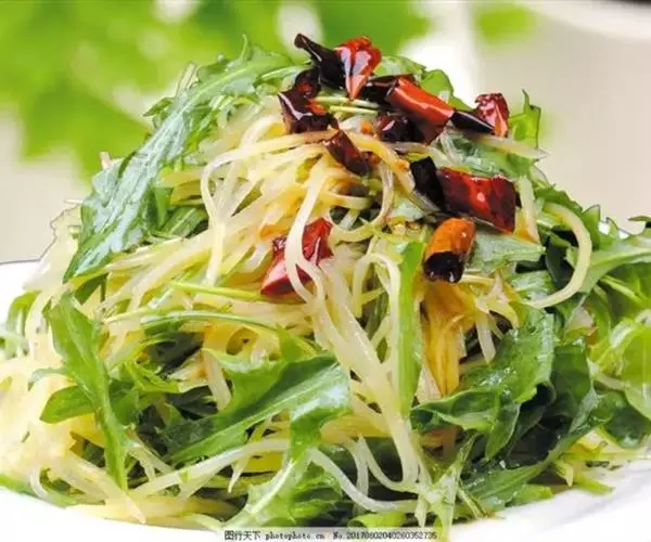 6、锅里的香辣油再次烧热,趁热浇在土豆丝上拌匀即可。