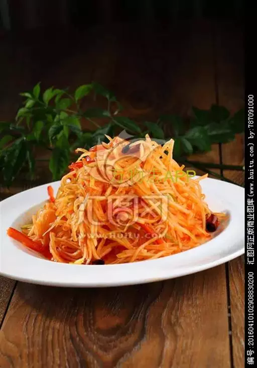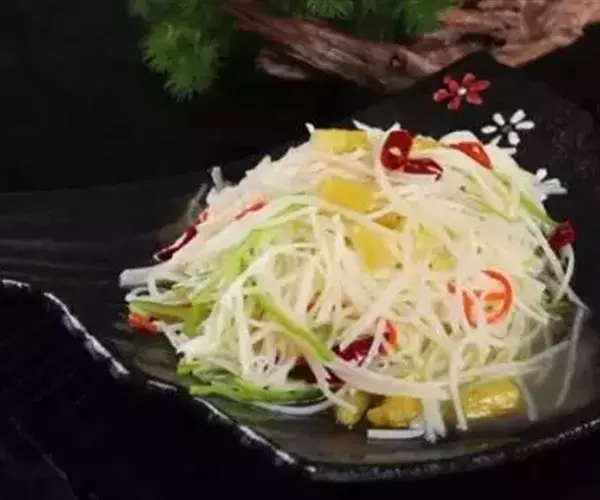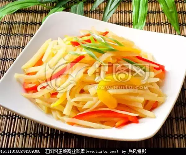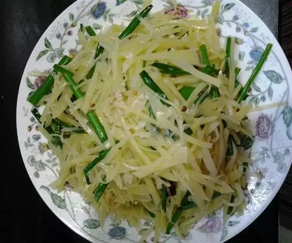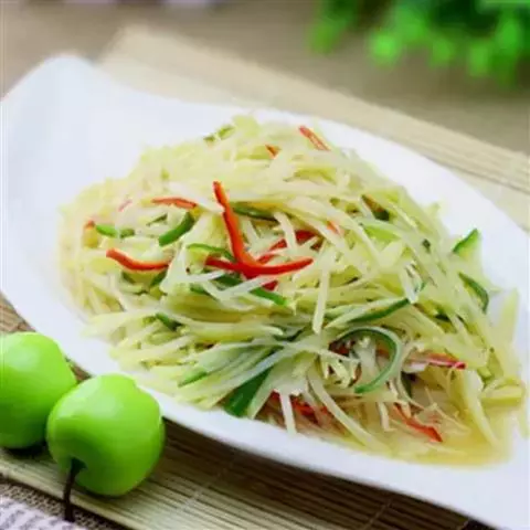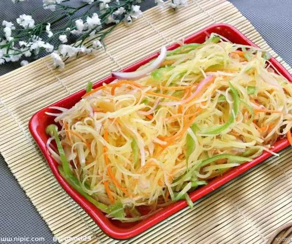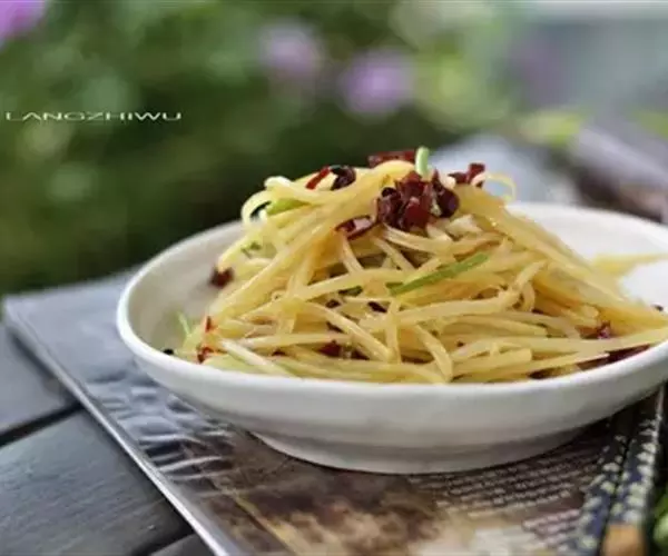 8、土豆丝装盘,上桌前浇上调味汁,拌匀即可。