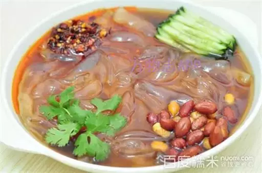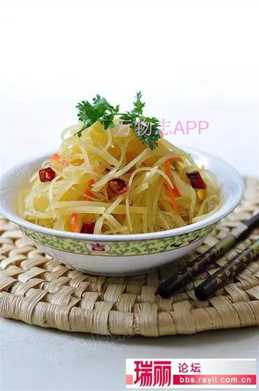 7.加青红椒丝,香菜,醋,盐,糖,辣椒油,香油拌匀即可。