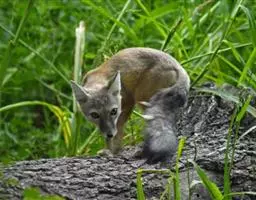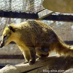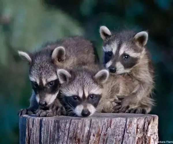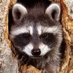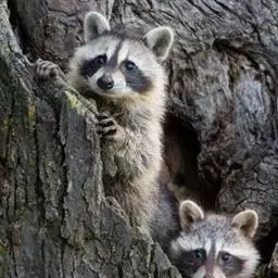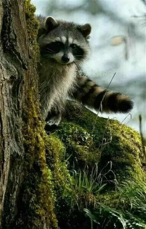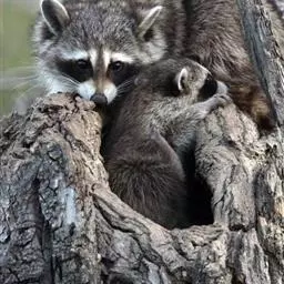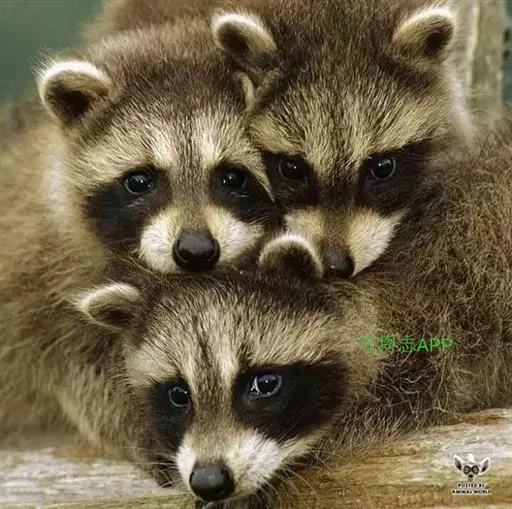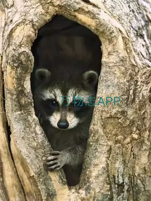 树洞里的小浣熊 浣熊只在繁殖期才会成对。公浣熊会同时与几头母熊交配,但母熊一般只接受一位求偶者。平时温驯安详的公熊在交配季节常常会互相叫嚷和厮打。