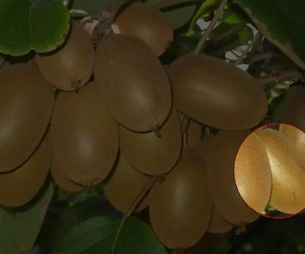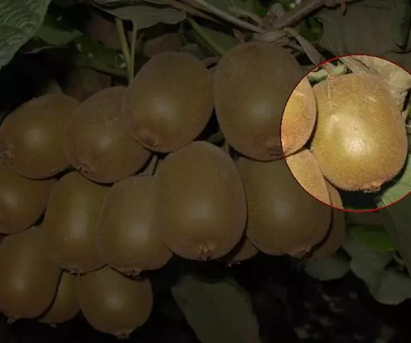 中华猕猴桃果型大,单果重在70~100g之间;果皮黄褐色,密被细毛;果肉呈绿色、黄色或浅黄色,横切面有浅色条纹;果心为白色或浅黄色;种籽黑褐色或紫褐色。果实中维生素C含量特别高,一般每100g鲜果中含维生素C100~200mg,高者可达420mg;含糖8%~14%;总酸1%~4.2%;含有天门冬氨酸0.446%、苏氨酸0.210%、色氨酸0.185%、谷氨酸0.6002%、甘氨酸0.240%、丙氨酸0.245%、脯氨酸0.3615%、胱氨酸0.102%、甲硫氨酸0.023%、异亮氨酸0.237%、亮氨酸0.294%、酪氨酸0.140%、苯丙氨酸0.197%、赖氨酸0.214%、组氨酸0.125%、精氨酸0.304%及氨基丁酸、羟丁氨基酸等多种氨基酸;还含有猕猴桃碱、蛋白水解酶、单宁,以及钙、磷、钾、铁等多种矿物质元素。