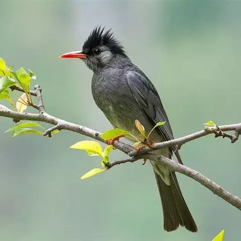 灰短脚鹎,体长19-22厘米。头顶和短的羽冠黑色,上体暗灰色,耳羽灰褐色,两翅表面橄榄绿黄色。…