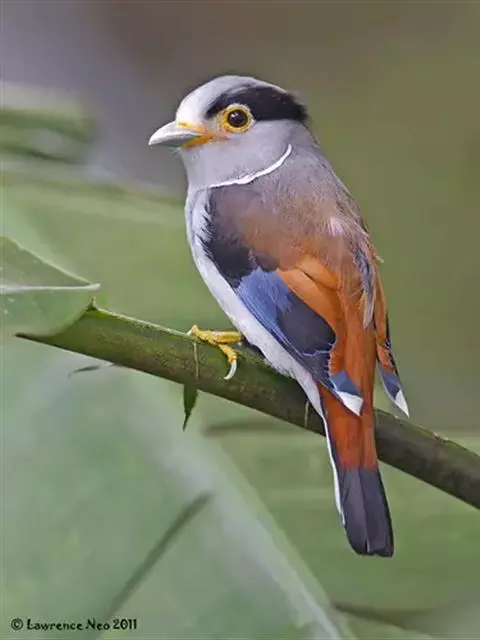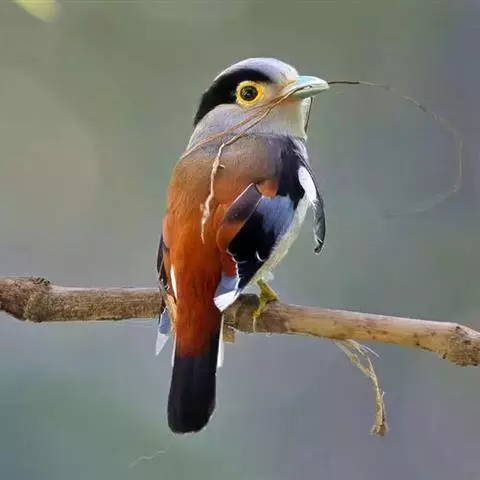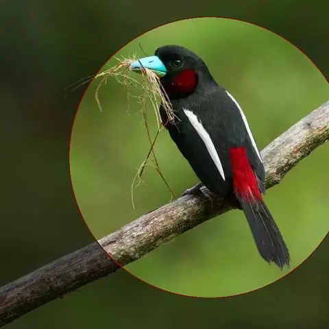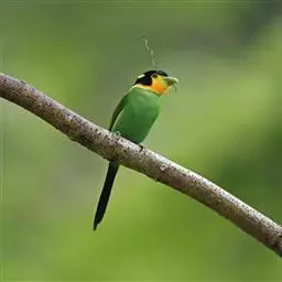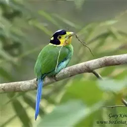 长尾阔嘴鸟是雀形目阔嘴鸟科的鸟类,体长约25厘米,是绿色阔嘴鸟。形长的楔形尾蓝色,喉及脸黄色,顶冠…