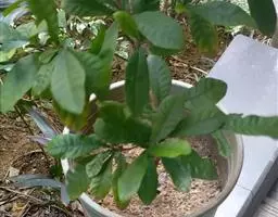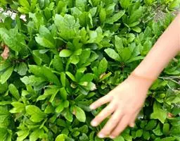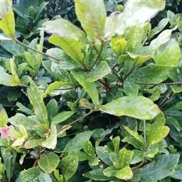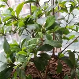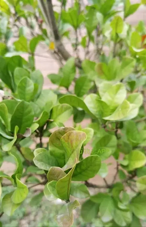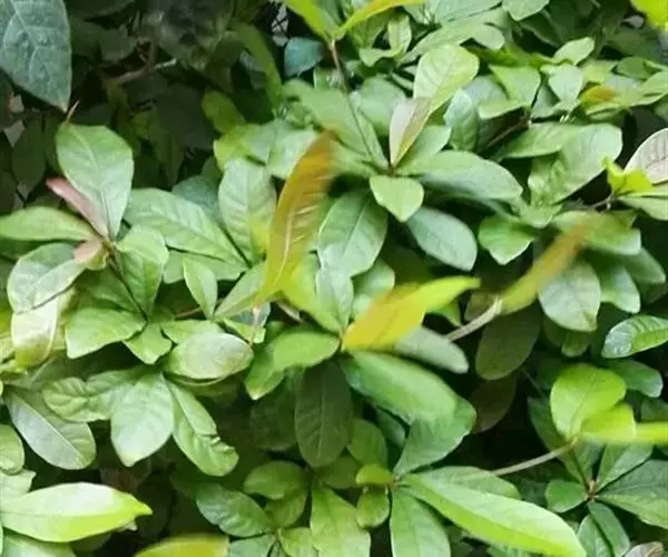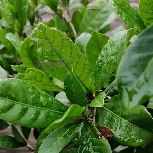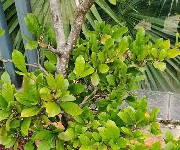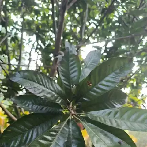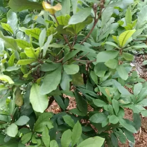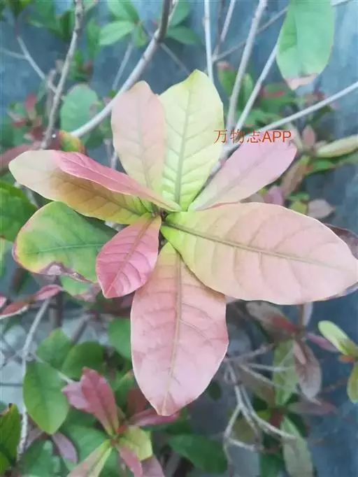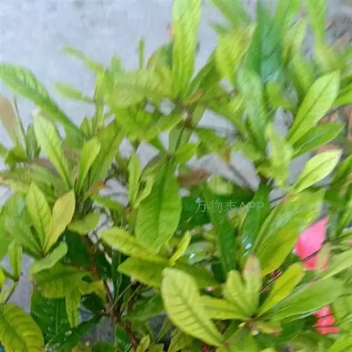 多年生常绿灌木,树高3-4.5米,枝、茎灰褐色,枝上有不规则的网线状灰白色条纹,分枝部位低,枝条数量多,若温度适合全年可抽发新梢,呈浅红色,叶枝端簇生,每簇有叶5-7片,叶互生,琵琶形或倒卵形,叶面青绿,叶背草绿,革质,长3.6-7.6厘米、宽2.7-3厘米,叶柄短、0.5厘米左右,叶脉羽状。