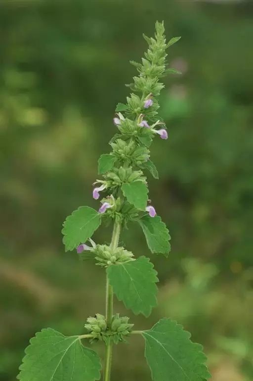 叶阔卵圆形,长4-9厘米,宽2.5-6.5厘米,先端急尖或短渐尖,基部截状阔楔形,边缘有不规则的牙齿,草质,上面榄绿色,被短伏毛,脉上尤密,下面灰绿色,有极密的白色短绒毛,在脉上的较长,叶柄长1-4.5厘米;苞叶叶状,向上渐变小,均超出轮伞花序,具短柄或近无柄。