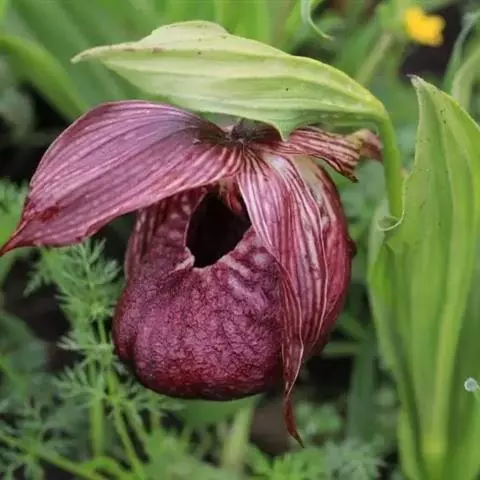 大花杓兰因其形状酷似一个口小肚大的囊袋,又名“大口袋兰”。花体呈紫红色,花朵直径5厘米至6厘米,…