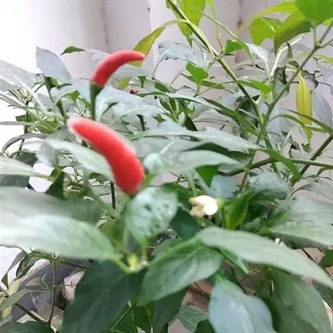 小米粒椒因其果如米粒大小,幼果乳白色而俗称之。株高25厘米左右,分枝多,株型优美,果多,果实呈长扁圆形,果径0.5厘米左右,单果重5克,味辣。其果实在成长过程中有白、紫、红等变化,花白色,叶片深绿色,细小。果实朝上生长,较耐荫,容易管理,观果期长,是家庭用来盆栽观果的最佳辣椒品种之一。因株型小巧,可将盆果置于装饰柜上供观赏。
