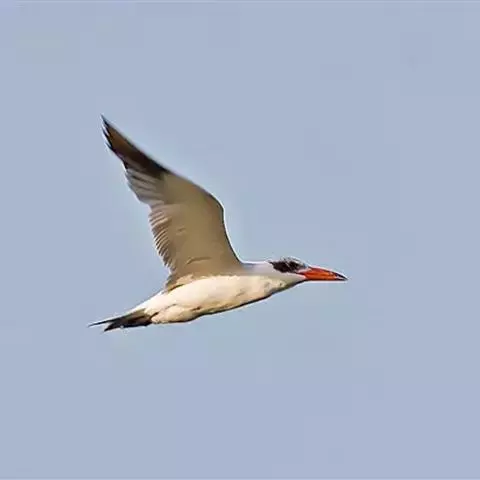 红嘴巨鸥,大型水鸟,体长47~55厘米。夏羽前额、头顶、枕和冠羽黑色。后颈、尾上覆羽和尾白色,…