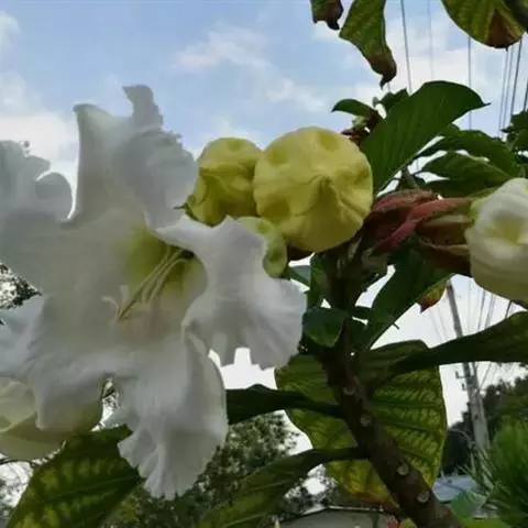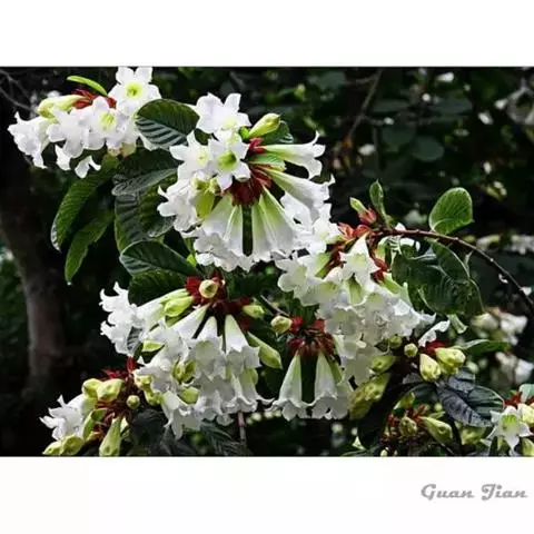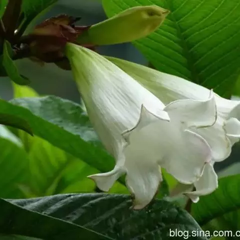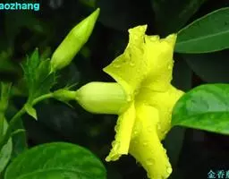 高大木质藤本。全株有乳状液计,枝幼时有锈色柔毛,茎有皮孔。单叶对生;叶柄长达2cm;叶片革质,长圆状倒卵形,长6-15cm,宽3-8cm,先端短渐尖,基部楔形。聚伞花序顶生,着花3-5朵;花梗长2-4cm,花5数;花萼裂片长圆状披针形、倒卵形或倒披针形,长2.5-4cm;花冠长约10cm,漏斗状,裂片卵圆形;雄蕊着生于花冠筒的喉部,花药箭头状。蓇葖果形状多变,圆柱形,长15-18cm,直径3-4cm;内果皮亮黄色。种子长约2cm,种毛白色绢质,长达4cm。花期春、夏季,果期秋、冬季。