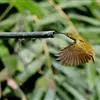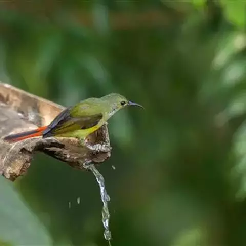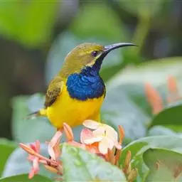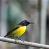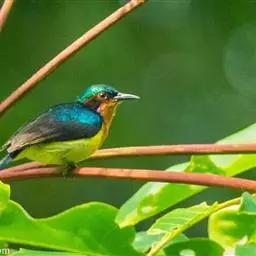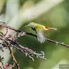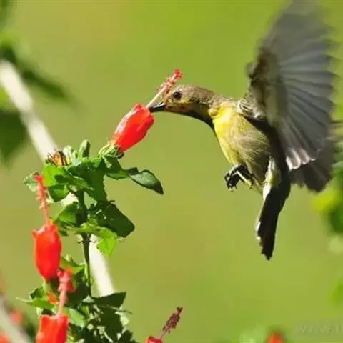 叉尾太阳鸟,雀形目太阳鸟科太阳鸟属留鸟;为小型鸟类,雄鸟头顶辉蓝绿色,上体橄榄绿色,腰明黄色,…