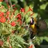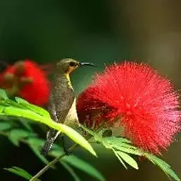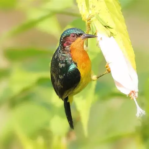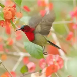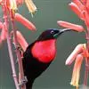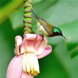 黑胸太阳鸟:小型鸟类,体长9-15厘米。嘴细长而向下曲。雄鸟中央尾羽特长,尾呈楔形,…