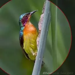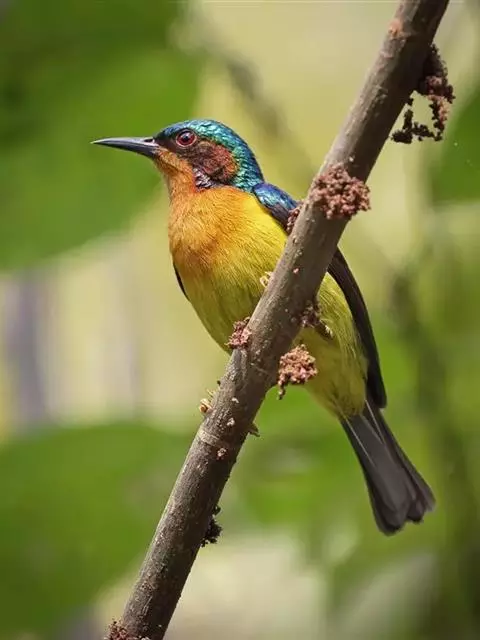 体小而色彩艳丽的太阳鸟。雄鸟:顶冠及上体闪辉深绿色,脸颊深铜红色,腹部黄,喉及胸橙褐。…