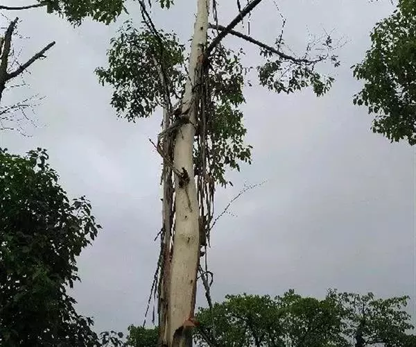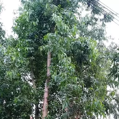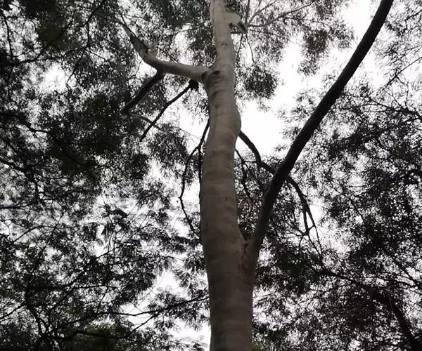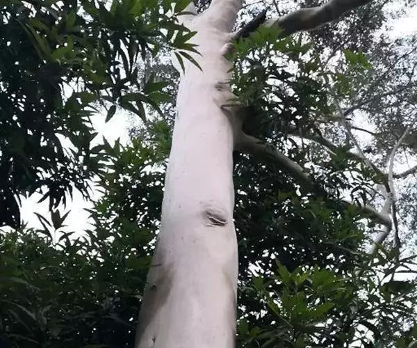 柠檬桉林 大乔木,高28m,树干挺直;树皮光滑,灰白色或红灰色,大片状脱落。幼态叶片披针形,有腺毛,基部圆形,叶柄盾状着生;成熟叶片狭披针形,宽约1cm,长10-15cm,稍弯曲,两面有黑腺点,揉之有浓厚的柠檬气味;过渡性叶阔披针形,宽3-4cm,长15-18cm;叶柄长1.5-3cm。