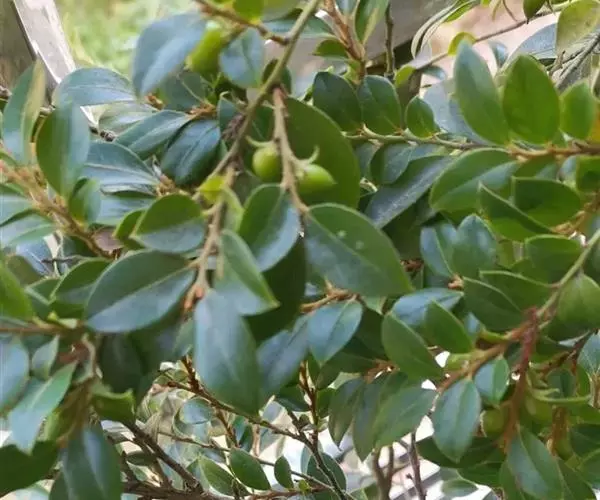 叶革质或薄革质,通常卵形,长2-3厘米,宽9-12毫米,较小的叶有时近圆形。叶先端急尖,有短针尖,基部钝或近圆形,全缘,叶边初时有睫毛。叶片表面深绿光亮,无毛,叶背浅绿色,中脉上面初时有短柔毛,中脉在两面凸起,侧脉和小脉极不明显。叶柄很短,长约1毫米,有锈色毛,后变无毛。