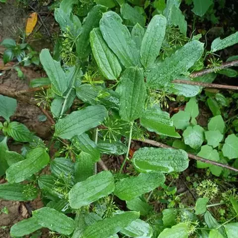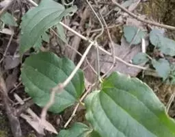 菝葜是攀援灌木植物;根状茎粗厚,坚硬,为不规则的块状,粗2-3厘米。茎长1-3米,少数可达5米,疏生刺。叶薄革质或坚纸质,干后通常红.褐色或近古铜色,圆形、卵形或其他形状,长3-10厘米,宽1.5-6 (-10)厘米,下面通常淡绿色,较少苍白色;叶柄长5-15毫米,约占全长的1/2-2/3具宽0.5-1毫米(一侧)的鞘,几乎都有卷须,少有例外,脱落点位于靠近卷须处。